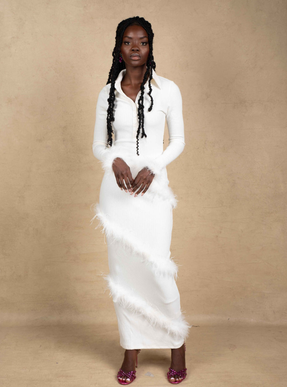 Made with plushest and softest heavyweight knit fabric and feathers swirling round, the Aina will have you feeling stylish and comfortable. Like its name implies, it is a timeless piece that you need in your closet.