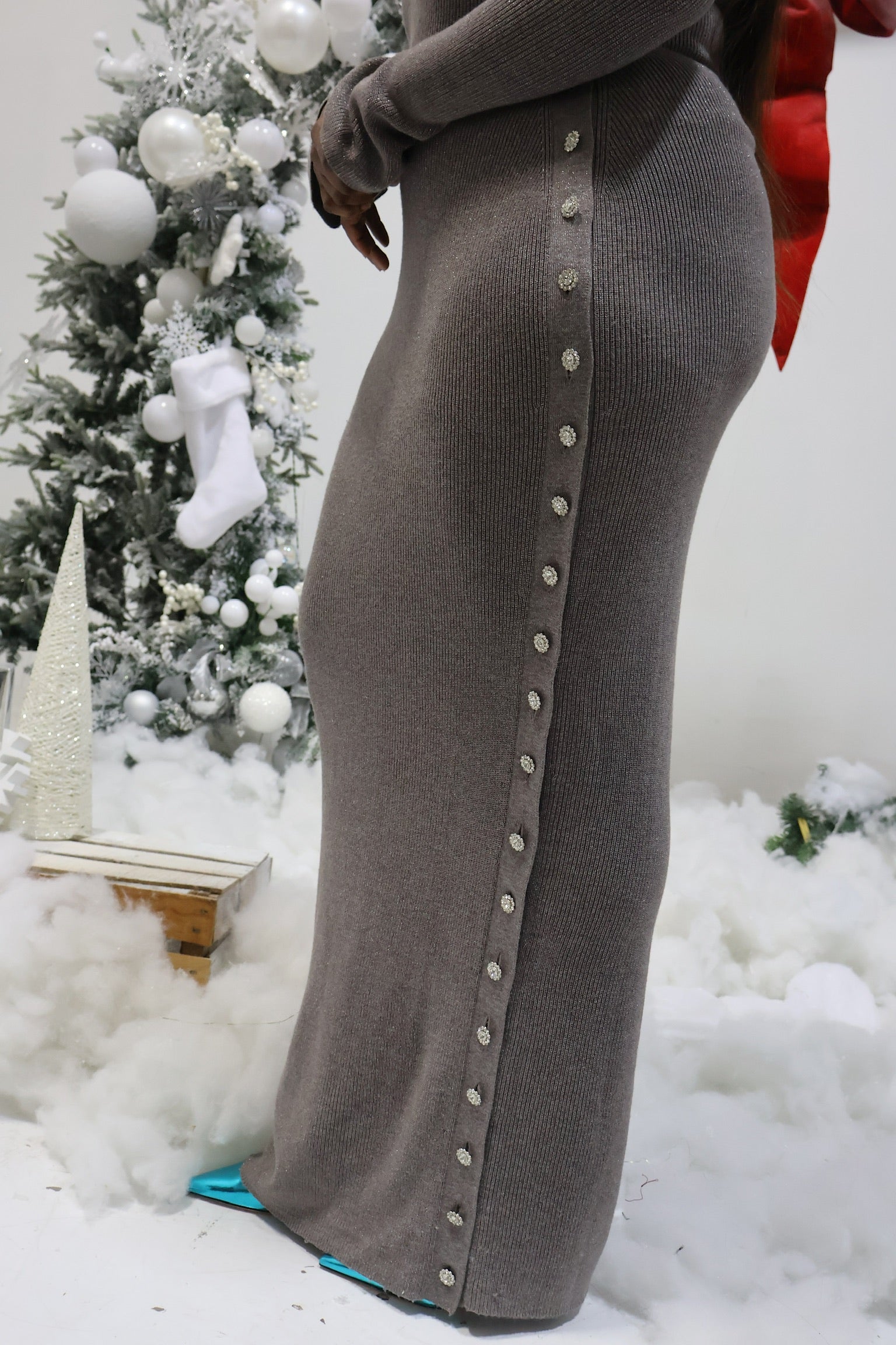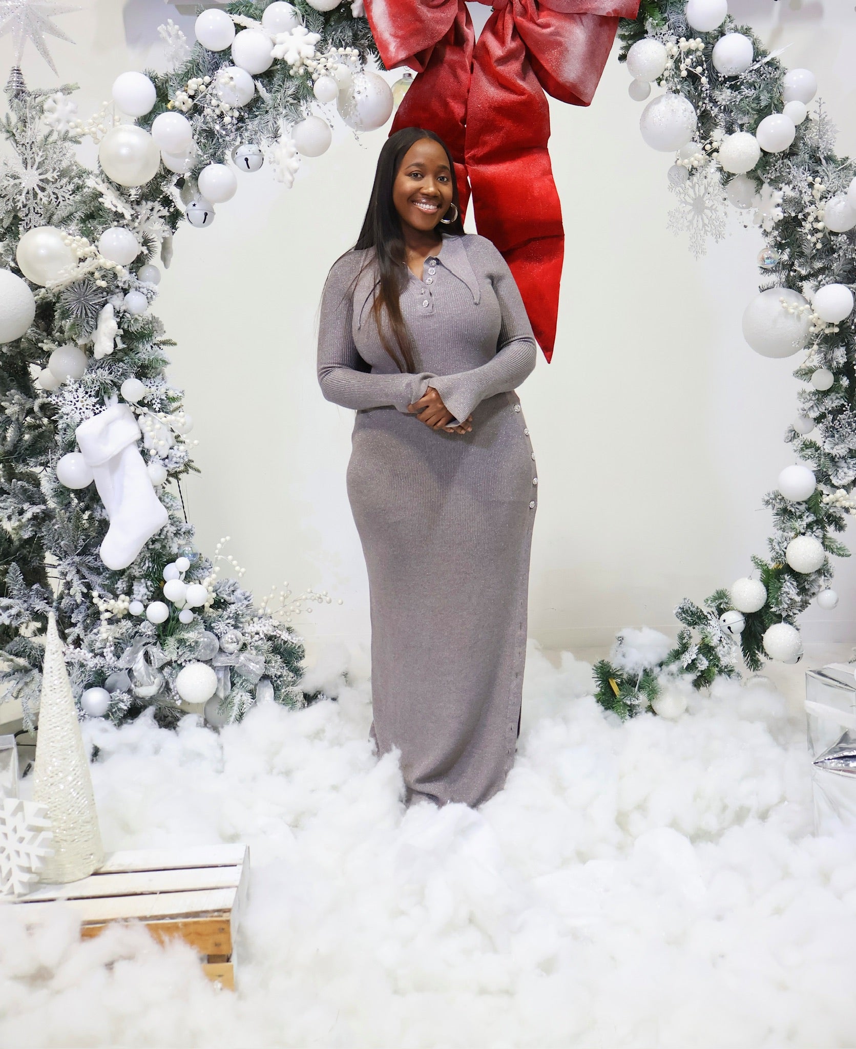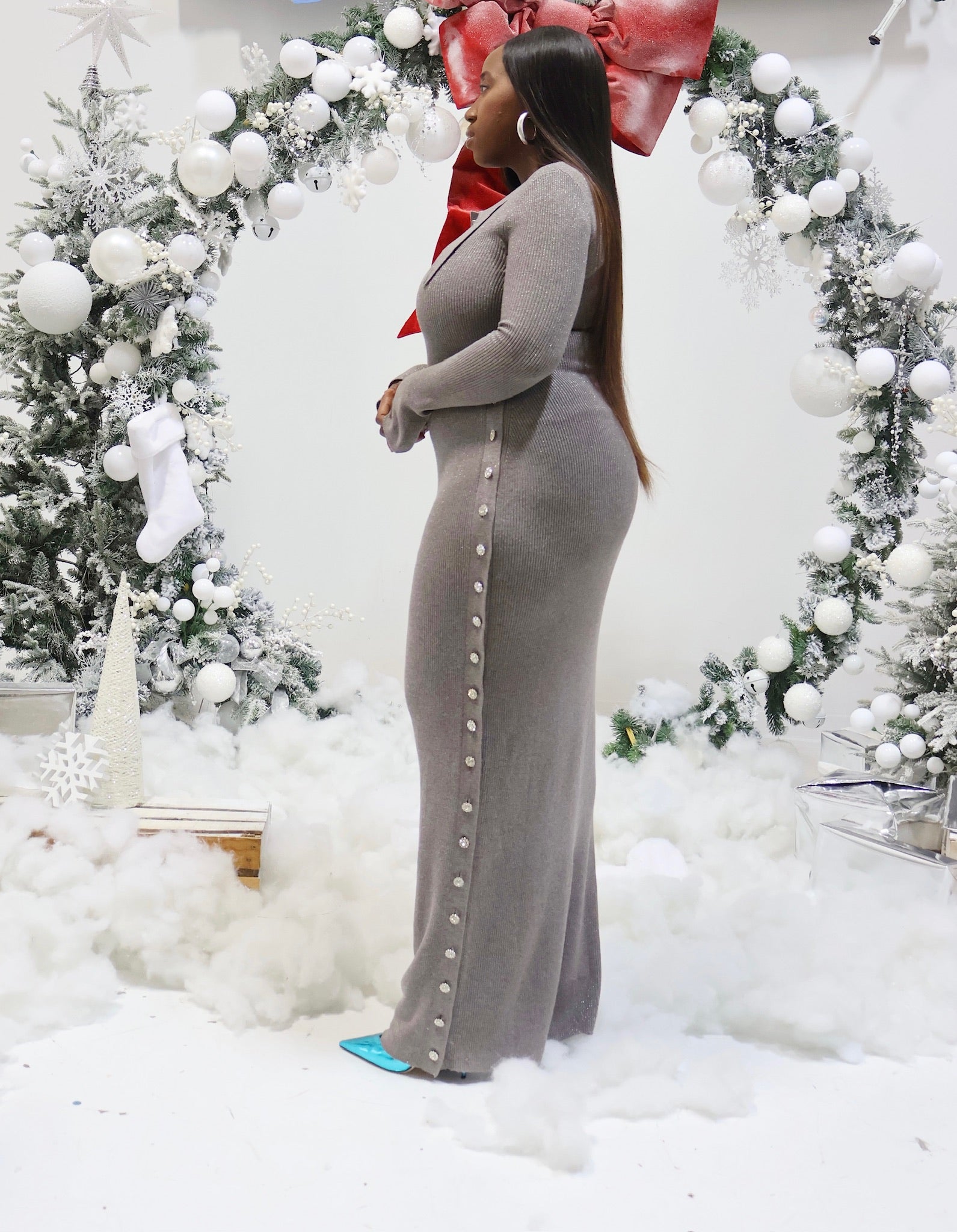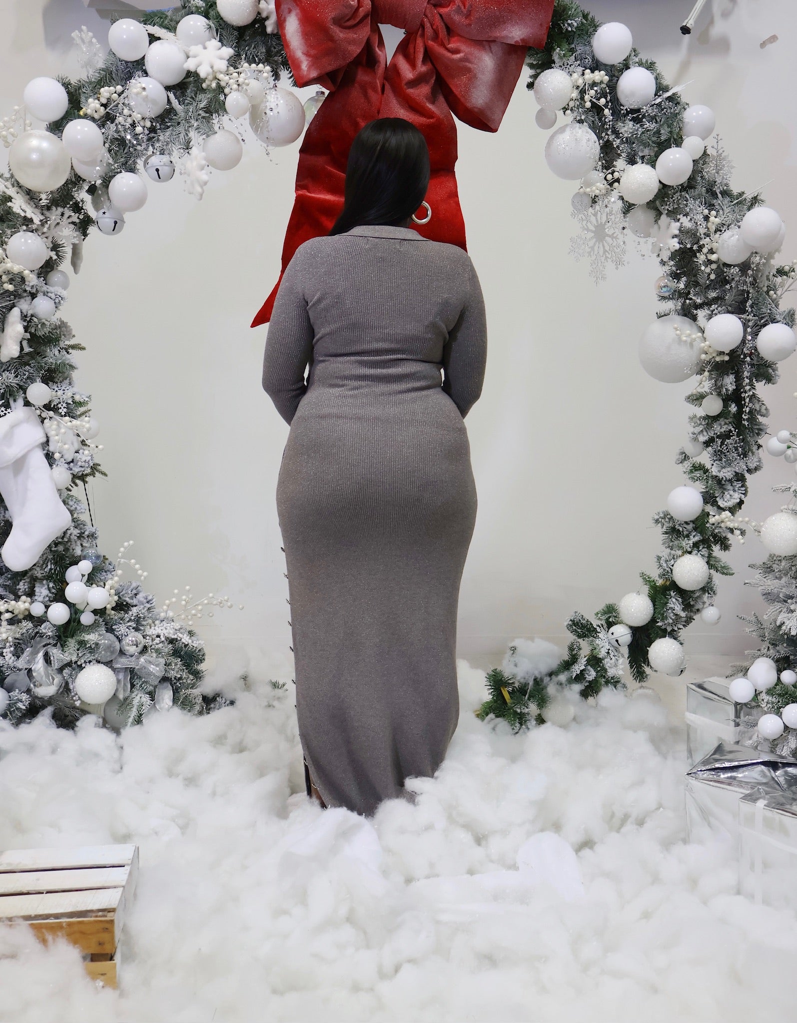 Step into the holiday season with a touch of glamour and sophistication in our Grey/Silver Sparkle Long Sleeve Maxi Dress. Designed to captivate, this stunning dress features silver shimmer that catches the light from every angle, making you the center of attention at any celebration.